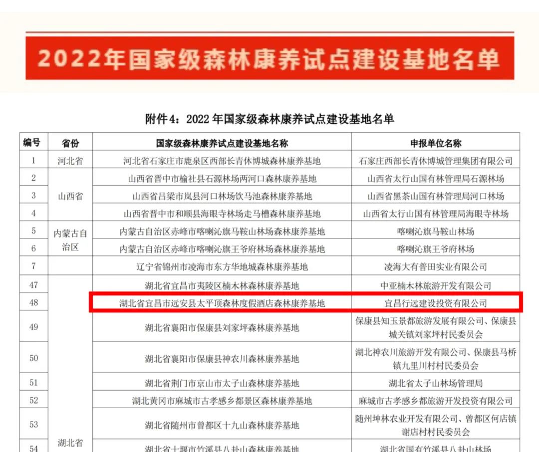 11月21日,中国林业产业联合会发布《2022年国家级森林康养试点建设单位认定结果公示公告》,宜昌城发集团旗下太平顶森林度假酒店成功入选国家级森林康养试点建设基地公示名单。