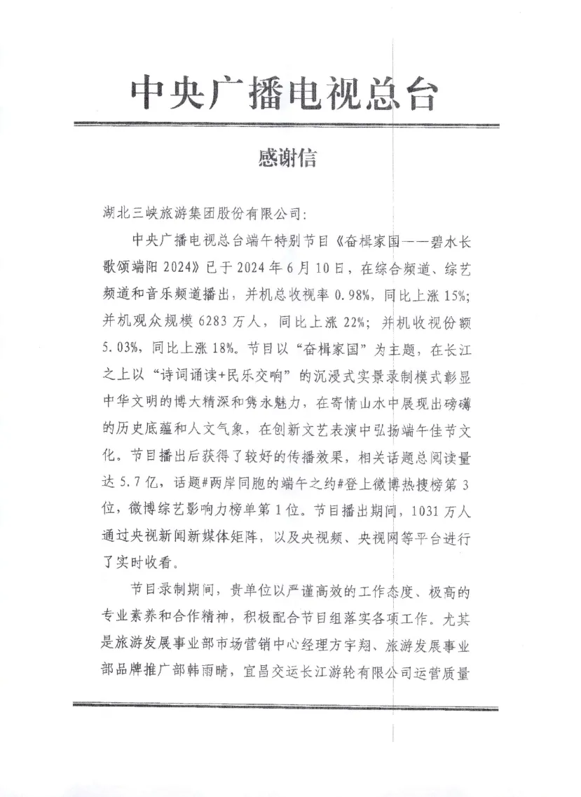 金杯银杯不如社会的好口碑。日前,三峡旅游集团收到了来自中央广播电视总台的感谢信。