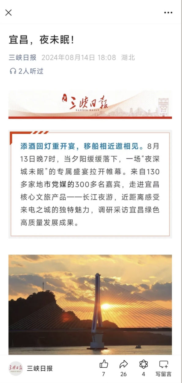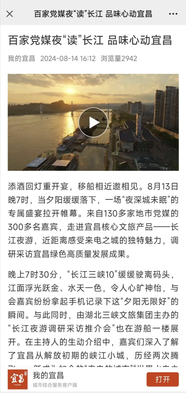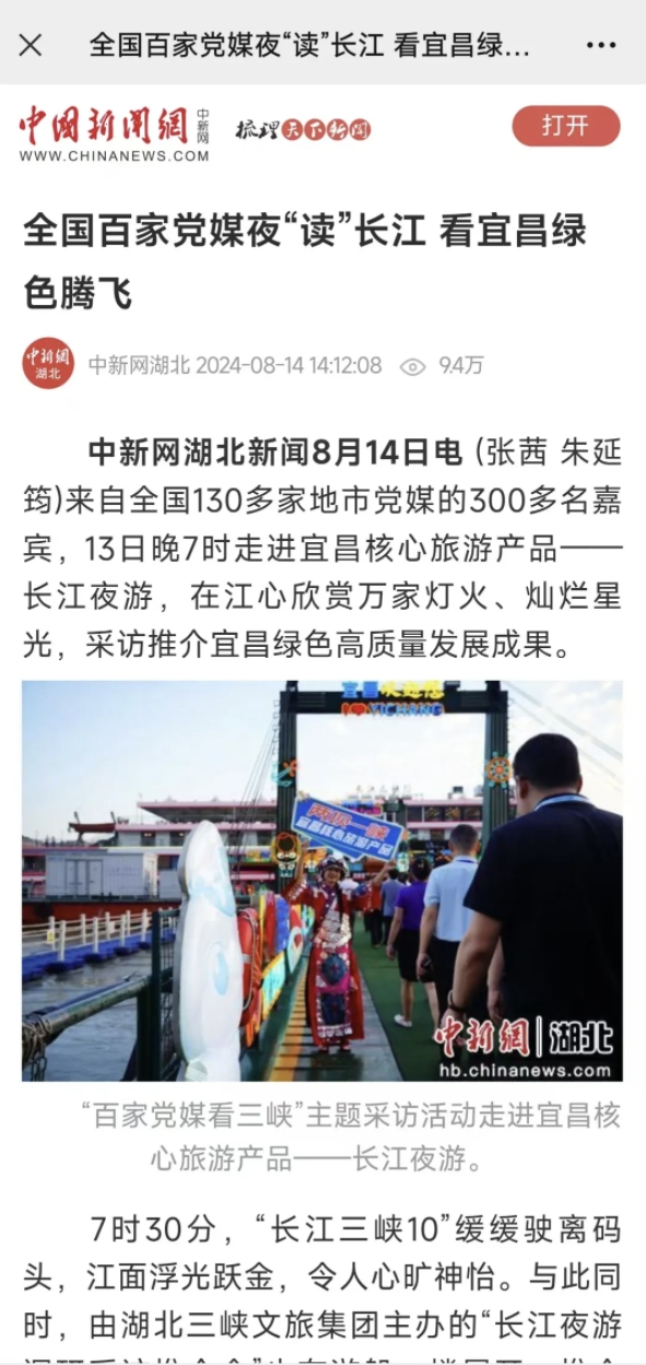 8月13日,中国地市报研究会2024年度理事大会暨“和美与共来电宜昌”百家党媒看三峡主题采访活动在宜昌开幕。当晚,来自全国130多家地市党媒的300多名嘉宾,走进宜昌核心旅游产品——长江夜游,领略宜昌绿色高质量发展之美。