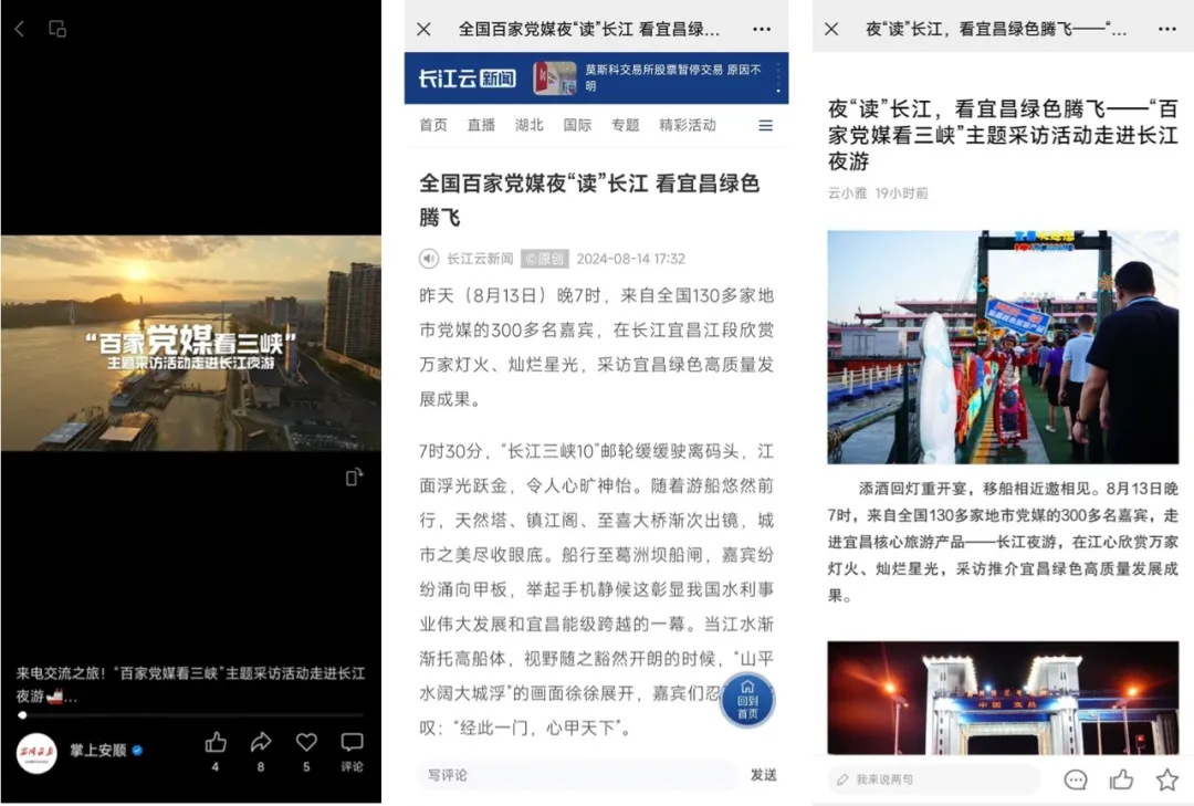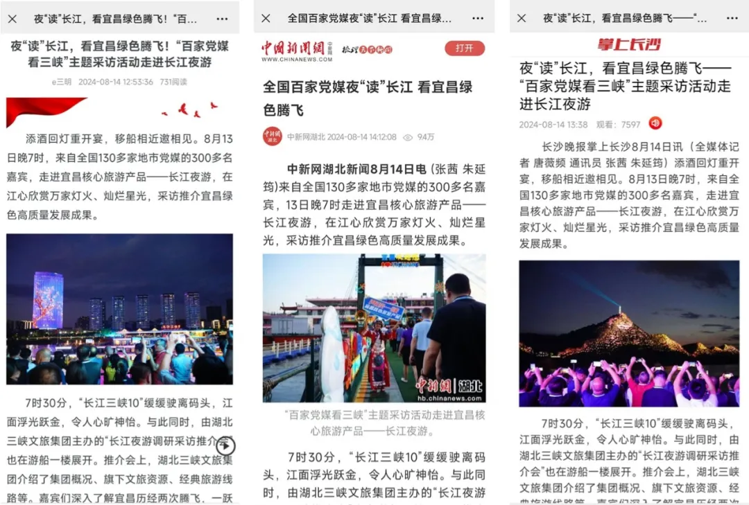 截止目前,中国新闻社、湖北日报、荆楚网、长江云、石家庄日报、许昌日报、安顺日报、三明日报、廊坊日报、渭南日报、湘潭日报、临沂日报、沧州日报、湄洲日报、十堰日报、连云港日报、岳阳日报、银川发布、遵义发布、黔江融媒、长沙晚报、郑州晚报、泉州晚报、岳阳晚报、中卫市新闻传媒中心、忠县融媒体中心、雅安市融媒体中心、神农架融媒体中心、遵义市新闻传媒中心、黔东南州融媒体中心、丽水市新闻传媒中心、荆州市融媒体中心、我的宜昌、宜昌发布、三峡日报等全国54家媒体争相报道,微信公众号、微博、抖音、视频号、客户端等线上新媒体全面开花。