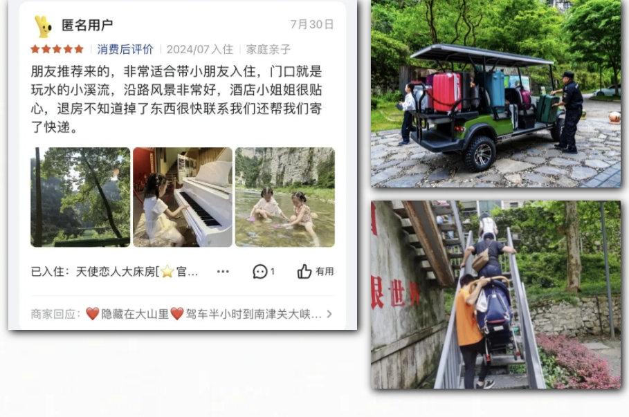 工作人员主动帮拖大件行李、推婴儿车的客人运送行李、扛婴儿车,把遗漏物品寄送回客人处,获得游客点赞。809微度假小镇美团评分保持在4.9分的高分。