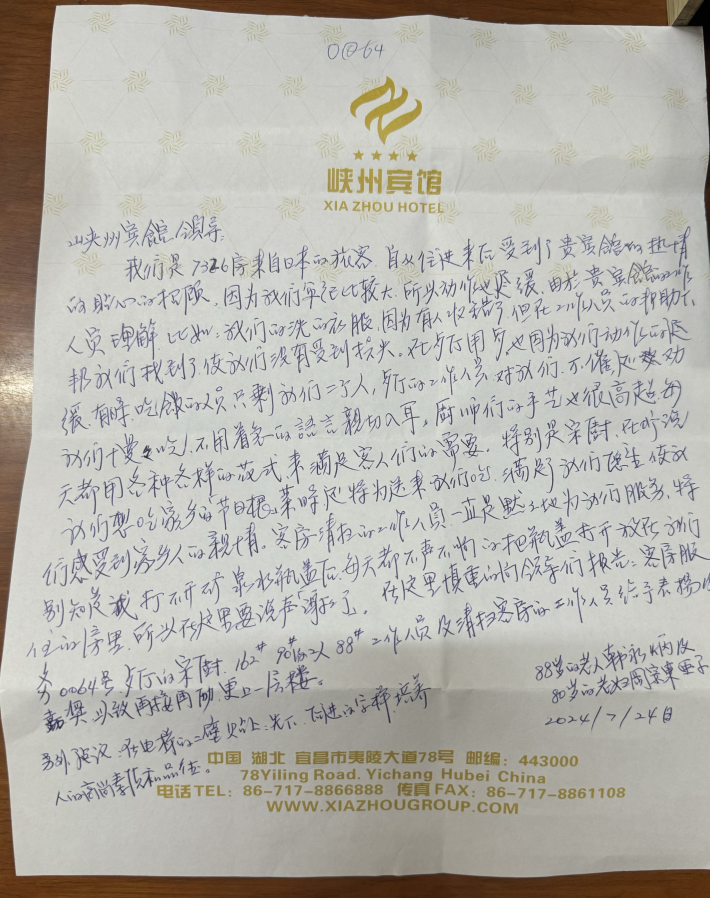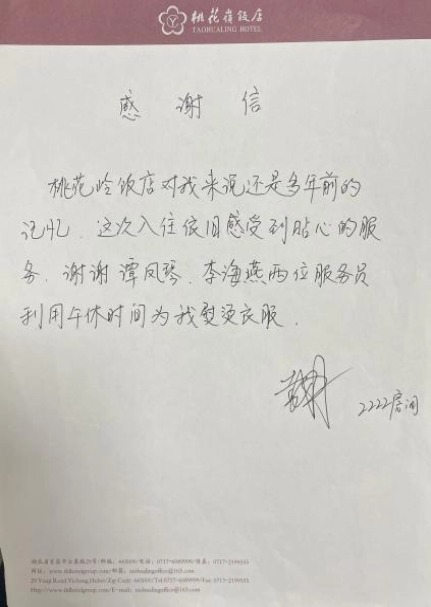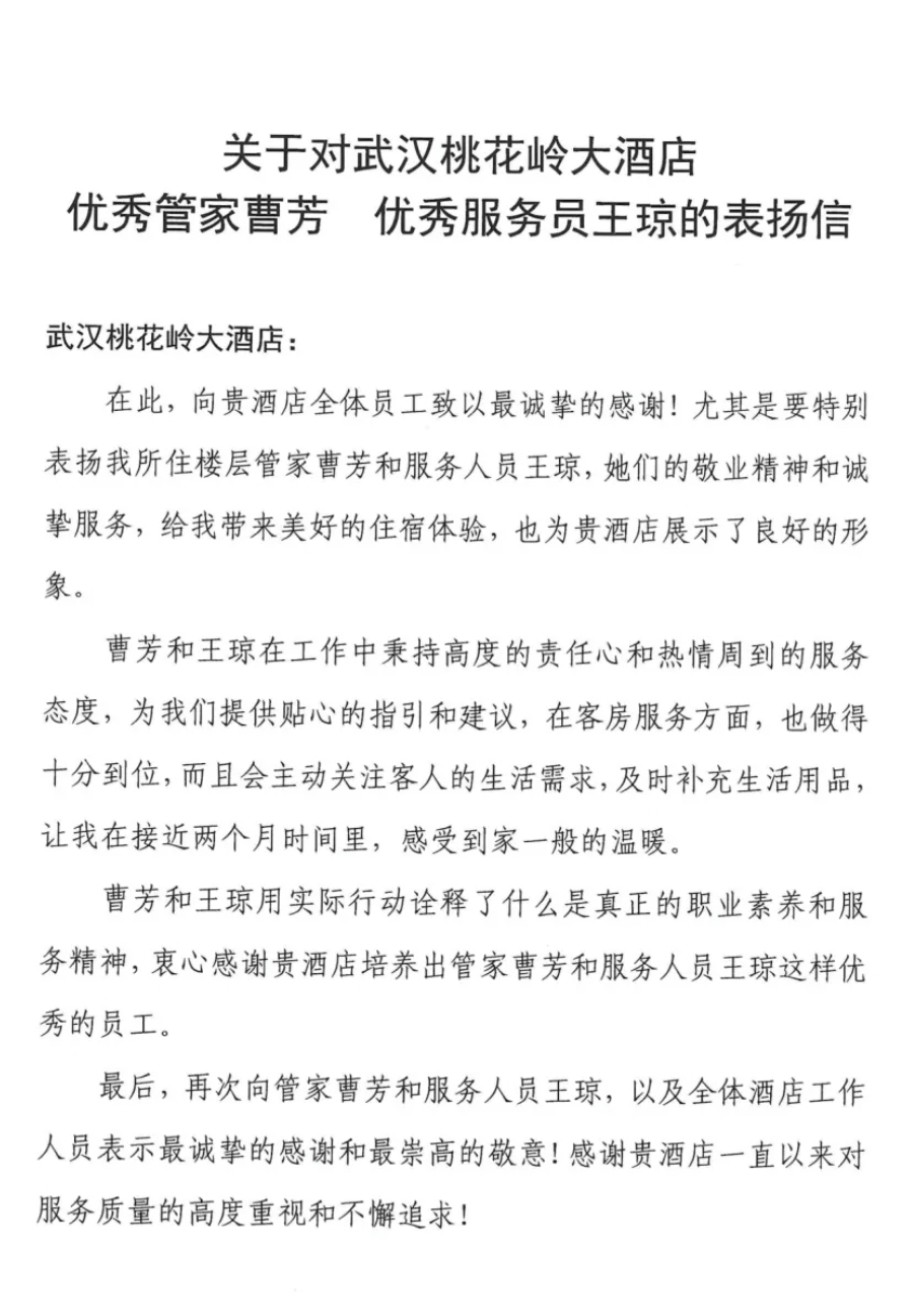 武汉桃花岭大酒店收到来自1018房客人的表扬信,该客人在酒店住了近两个月,着重称赞了酒店客房的“皇金管家”们,热情周到、温暖贴心。