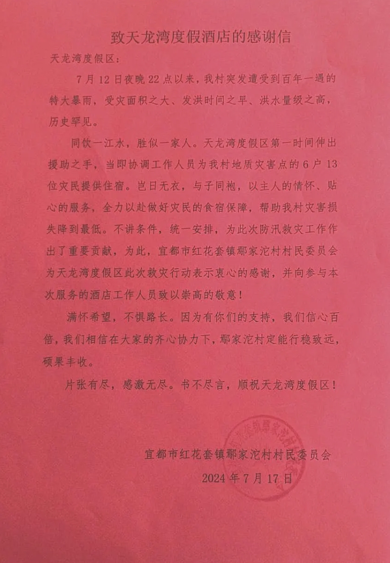 7月12日夜晚,红花套镇鄢家沱村接到市气象部门发布的暴雨红色预警和镇防汛指挥部下达的启动地灾点转移指令后,立即启动防汛预警,劝导邓家冲地质灾害点6户13名群众进行转移。一筹莫展时,天龙湾度假区伸出援手,负责人田少军立即组织酒店工作人员,调集生活物资,为地灾点附近的转移群众提供免费食宿。红花套镇鄢家沱村村民委员会写来感谢信。