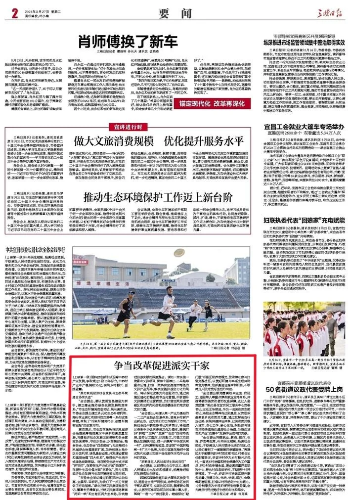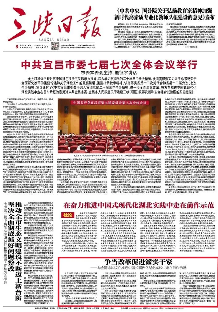 8月26日,市委七届七次全体会议举行,审议并通过了《中共宜昌市委关于深入贯彻党的二十届三中全会精神、进一步全面深化改革、努力在推进中国式现代化湖北实践中走在前作示范的意见》,与会同志深受鼓舞、激情满怀。大家纷纷表示,将深入学习贯彻市委全会精神,争当改革促进派、实干家,以钉钉子精神狠抓落实,为在推进中国式现代化湖北实践中走在前作示范作出更大贡献。