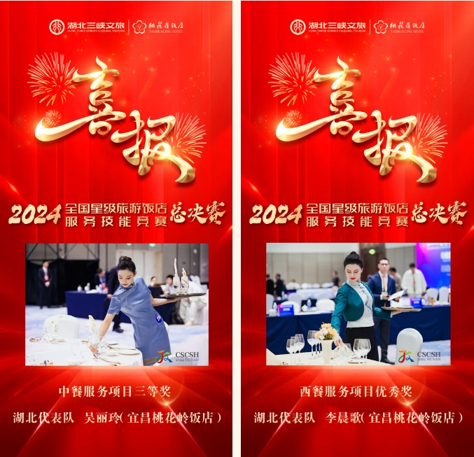 所属宜昌桃花岭饭店精心选派的两名选手吴丽玲荣获中餐服务项目三等奖,李晨歌荣获西餐服务项目优秀奖,为桃花岭饭店添光彩,为湖北省代表队获得团体三等奖奠定坚实的基础。