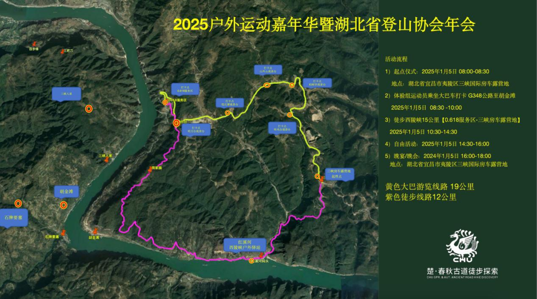 (二)紫色徒步线路(12公里):徒步西陵峡15公里【0.618服务区-三峡房车露营地】;时间:2025年1月5日 10:30-14:30