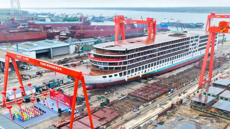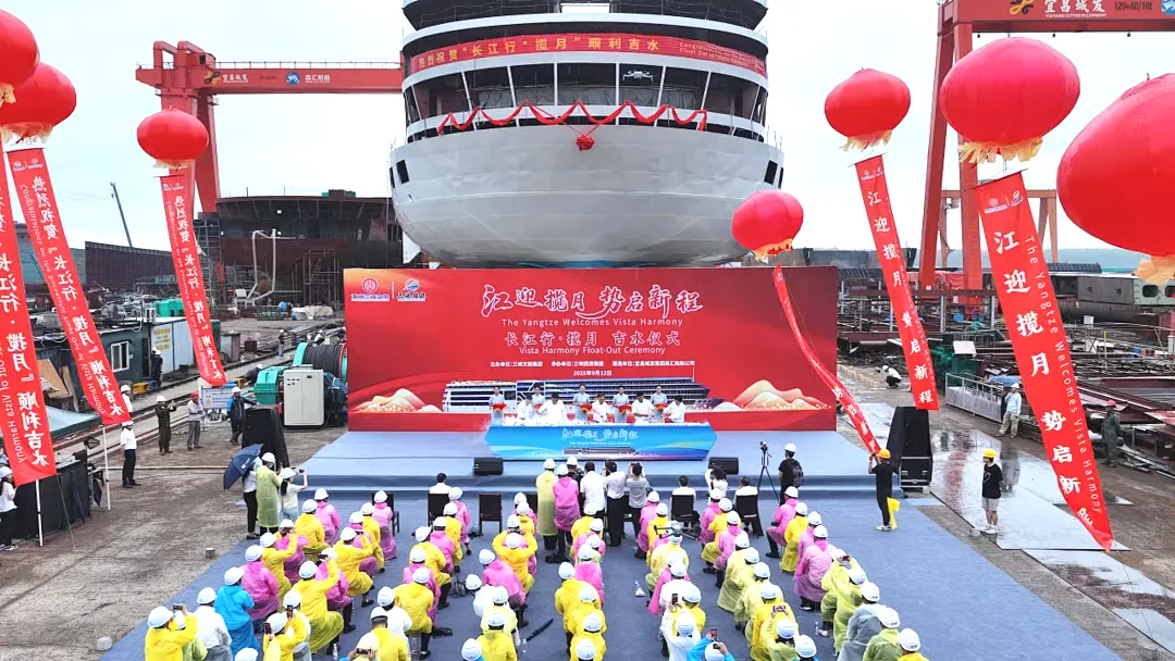 江迎揽月,势启新程。9月12日,由湖北成人网站在线 旗下三峡旅游集团投资建造的首艘长江省际度假游轮“长江行·揽月”在枝江鑫汇船厂顺利吉水,这标志着该游轮建造取得关键性进展,后续将转入舾装、软装、设备调试以及试验、检验等环节,全力冲刺2026年首航目标。